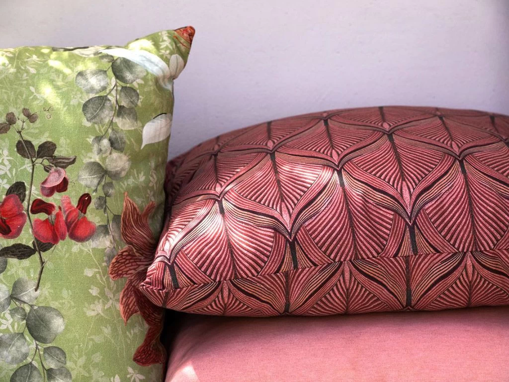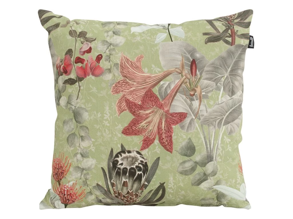 Het sierkussen heeft een print van verschillende kleurrijke planten op een groene ondergrond.
