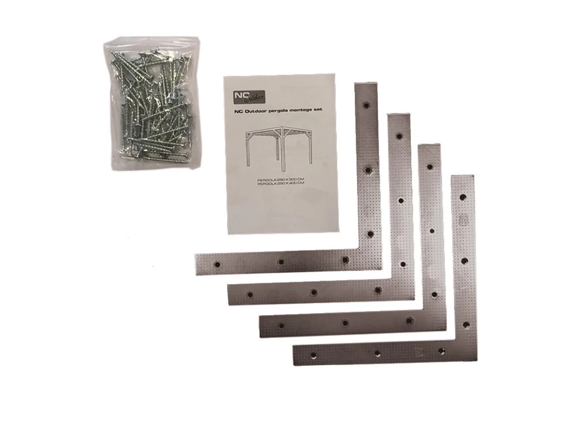 Deze pergola montageset bestaat uit 4 hoekdelen en 56 schroeven.