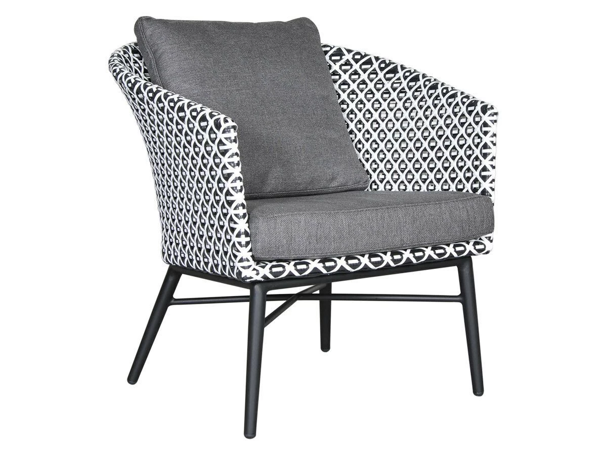 Zowel de bank als de 2 stoelen hebben een aluminium frame met daarop een kuip die afgewerkt is met kunststof wicker. Het vlechtwerk bestaat uit zwart en wit wicker waardoor er een mooi patroon ontstaat. De dikke kussens in de stoelen en bank zorgen voor een optimaal zitcomfort dat garant staat voor vele lange en gezellige avonden relaxen.