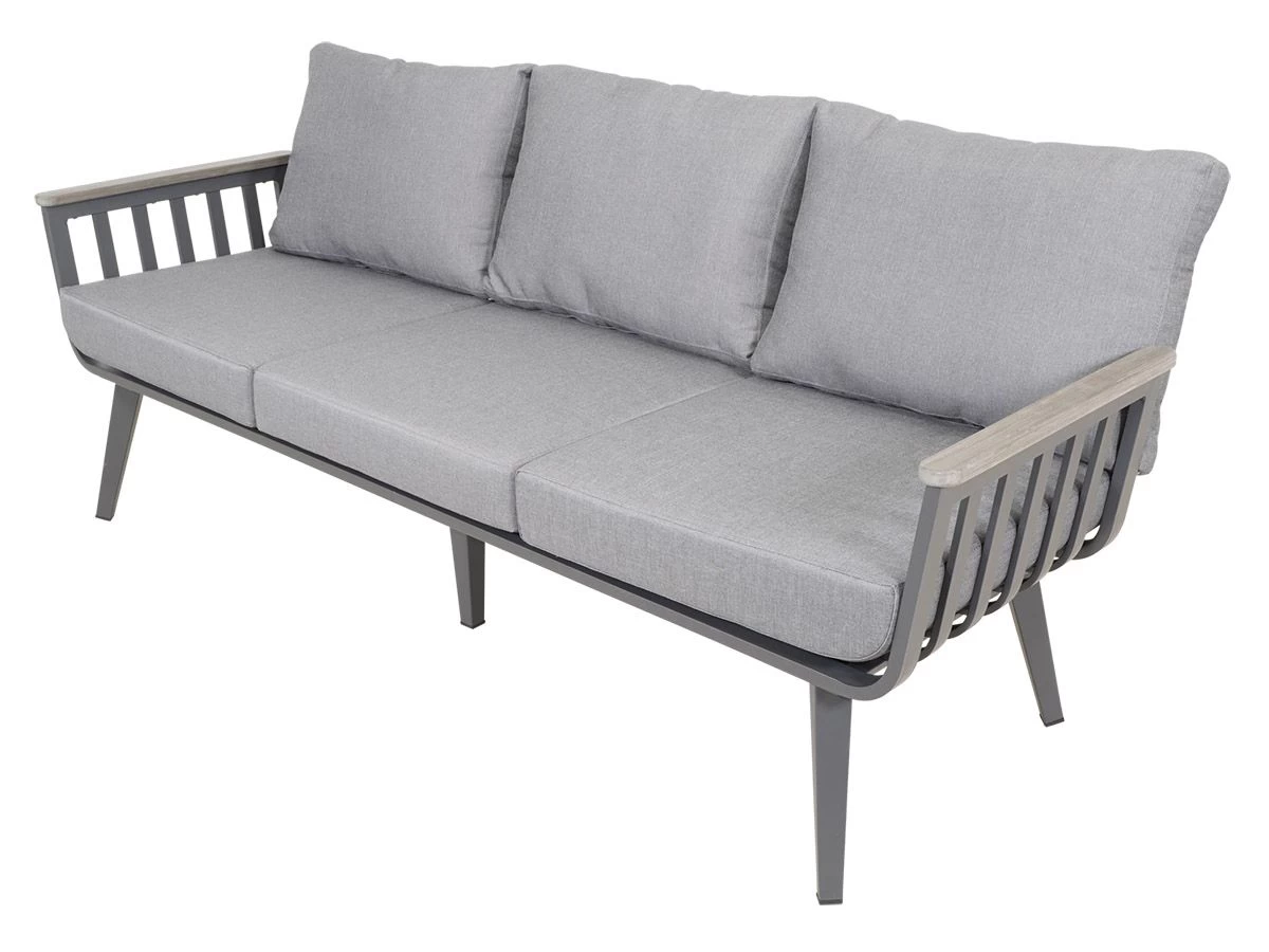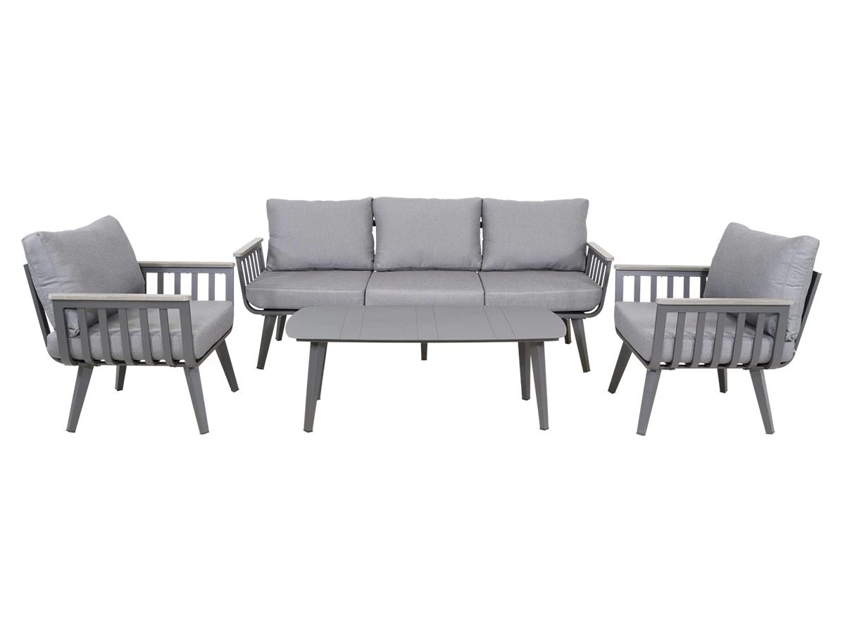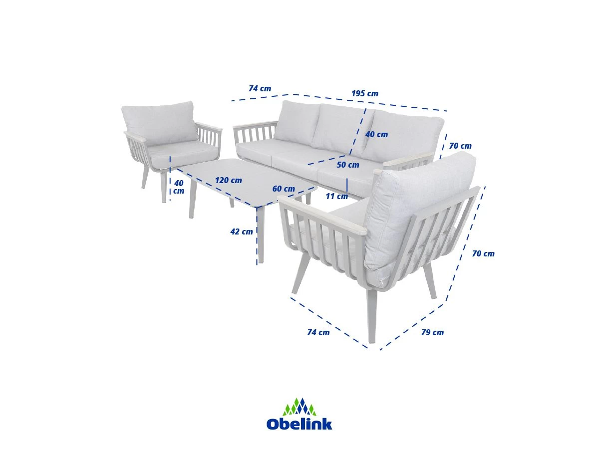 De Amalfi bestaat uit een bank (195 x 74 x 70 cm), 2 fauteuils (78,5 x 74 x 70 cm) en een salontafel (120 x 60 x 43 cm). Het frame van de set is gemaakt van gepoedercoat aluminium met daarop dikke kussens met een hoes van Olefin. Olefin is een makkelijk te reinigen stof en is voorzien van UV-remmers waardoor de stof kleurvast is.