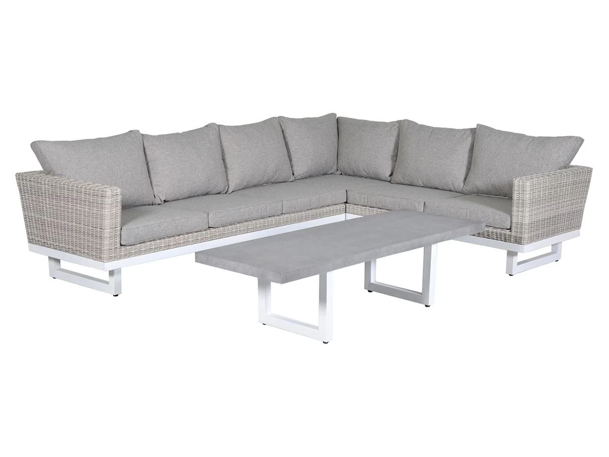 Dankzij het aluminium onderstel, het kunststof gevlochten wicker en het cementfiber tafelblad is deze set weerbestendig. Door de combinatie van deze materialen krijg je een sublieme uitstraling! De kussens zijn voorzien van een ritssluiting zodat de hoes uitwasbaar is.