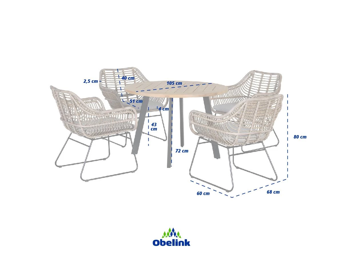 De kuipstoelen hebben een gecoat stalen frame met daaromheen kunststof vlechtwerkdraad. Voor extra zitcomfort zijn de stoelen uitgerust met een grijs zitkussen. De houten tafel heeft een diameter van 105 cm. Wij adviseren de tafel altijd te behandelen met een olie. Door de tafel goed te onderhouden verleng je de levensduur. Wanneer je de tafel buiten laat staan is het van belang dat je deze niet bedekt met een hoes. Hierdoor kunnen vochtplekken ontstaan.