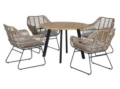 Gezellig met z’n 4 personen rondom tafel zitten eten of borrelen. Bij een ronde tafel kan iedereen elkaar goed aankijken wat door veel mensen als gezellig en knus wordt ervaren. De Medina tuinset is voorzien van een ronde eettafel met een mooi houten blad. Daaromheen staan 4 prachtige wicker kuipstoelen, dankzij het luchtig gevlochten wicker oogt het geheel luchtig en komt de set zelfs op een klein terras prachtig tot zijn recht.