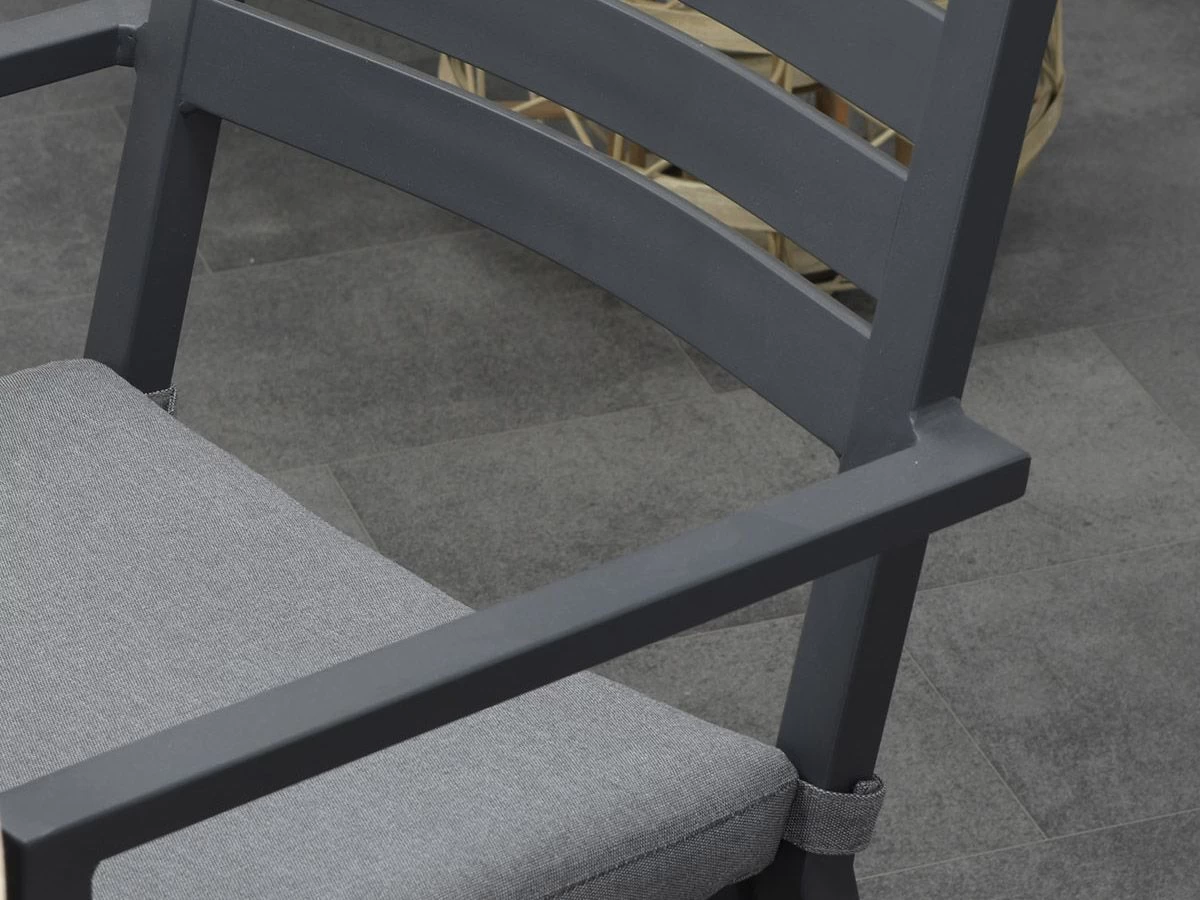 De stoel is gemaakt van hoge kwaliteit aluminium, hierdoor is de stoel onderhoudsvriendelijk, betrouwbaar en weerbestendig. De mat zwarte poedercoating zorgt voor bescherming tegen krassen. Het zitkussen wordt standaard meegeleverd en heeft een waterafstotende coating. Een onverwachte regenbui is dus geen probleem! De kussenhoes is afritsbaar, waardoor deze eenvoudig met de hand gewassen kan worden.