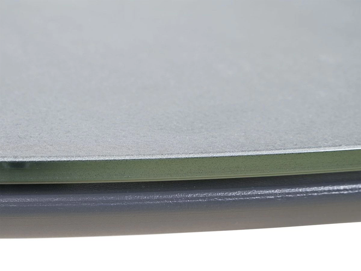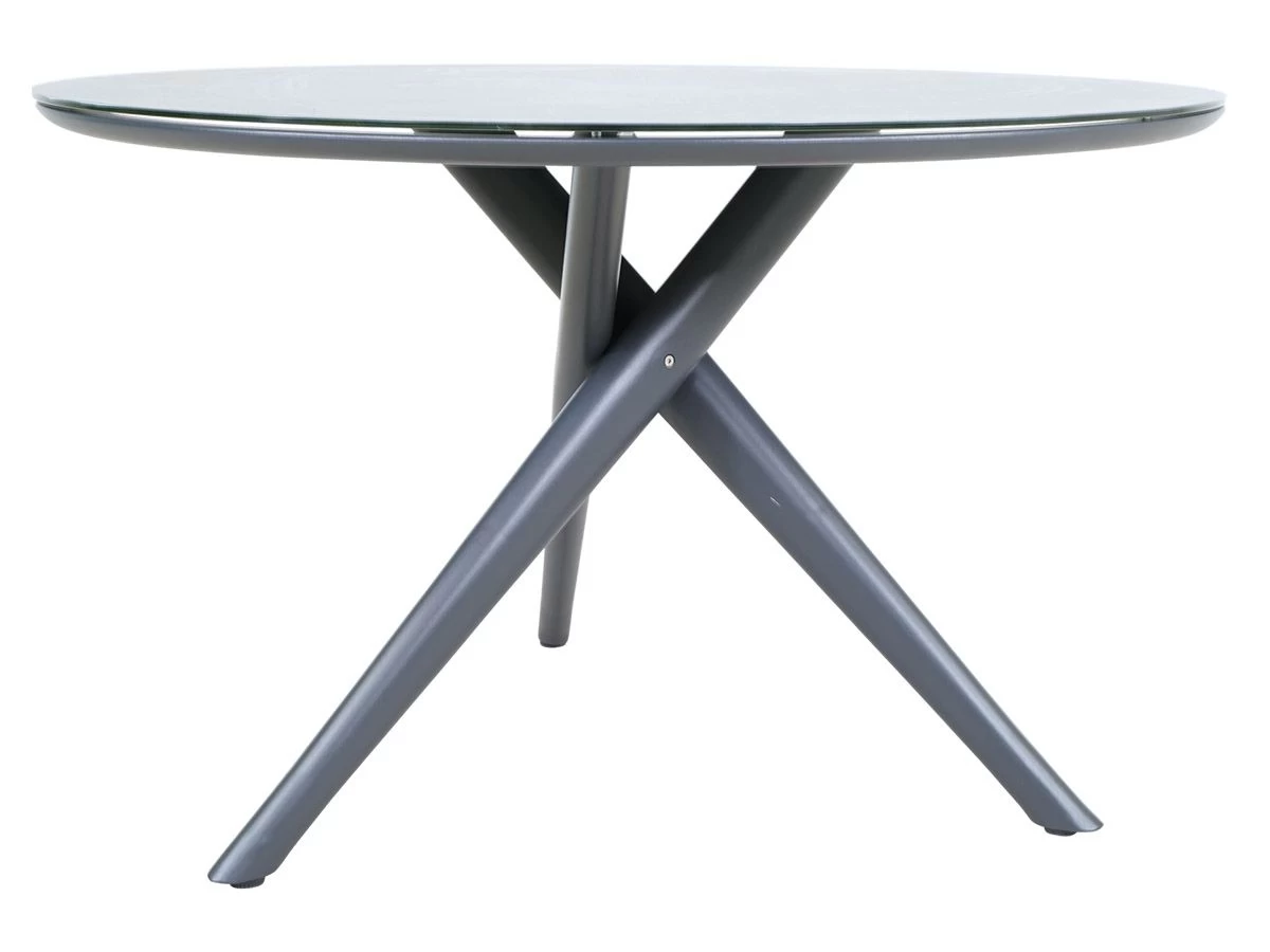 Het frame is van aluminium en het tafelblad is gemaakt van glas met een keramische coating. Hierdoor heeft de tafel weinig onderhoud nodig en is deze gemakkelijk schoon te maken. De tafel heeft een diameter van 120 cm en is 74 cm hoog.