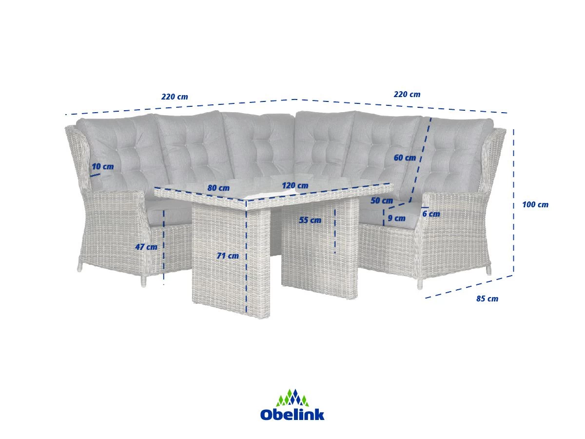 De hoekbank heeft een afmeting van ongeveer 220 x 220 x 100 cm met een zithoogte van ongeveer 46 centimeter. De afmeting van de tafel met glasplaat is ongeveer 80 x 120 x 70 cm. De set heeft een aluminium frame met kunststof gevlochten wicker. De kussens zijn gemaakt van hoge kwaliteit olefin. Olefin is duurzaam, vuilafstotend en zal niet verkleuren. De kussens zijn voorzien van een rits waardoor de hoezen met de hand te wassen zijn.
