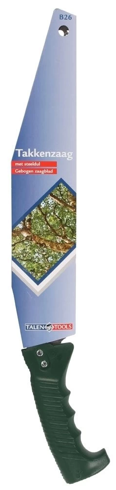 Deze takkenzaag is geschikt voor het snoeien van bomen en flinke struiken. Hij wordt gebruikt voor takken die te dik zijn voor een takkenschaar. Deze takkenzaag heeft een gebogen zaagblad, dit zorgt ervoor dat de tak niet wegglijdt tijdens het zagen. Deze takkenzaag is voorzien van een steeldul, hier kan een steel met een diameter van 28mm aangezet worden.